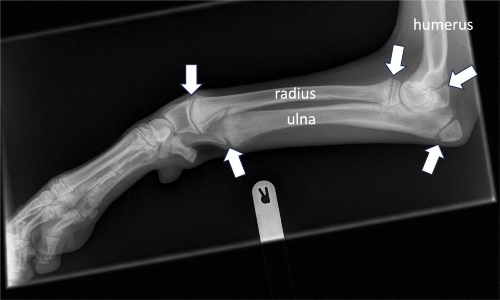 Dogs grow remarkably quickly. If one thinks that a large or giant breed dog is fully grown by 12-18 months of age, compared to a human being, that is a remarkable growth velocity. When vertebrate animals develop, their bones first form as cartilage models, which turn to bone through a process called ossification. Bones gain some of their length from growth at the very ends, but most of it develops at the “growth plate” (also called physes). Cartilage forms to widen the growth plate, and then turns to bone in a “wave” of ossification behind the growing part. Growth plates must grow at the same rate across the growth plate, otherwise the bone might start to deform. In addition, in the antebrachium (the forearm), there are two long bones, the radius and ulna, and so these two bones must grow at the same rate, otherwise there can be bowing of the antebrachium. Not surprisingly, the antebrachium is therefore the most common site of growth deformities in puppies.
